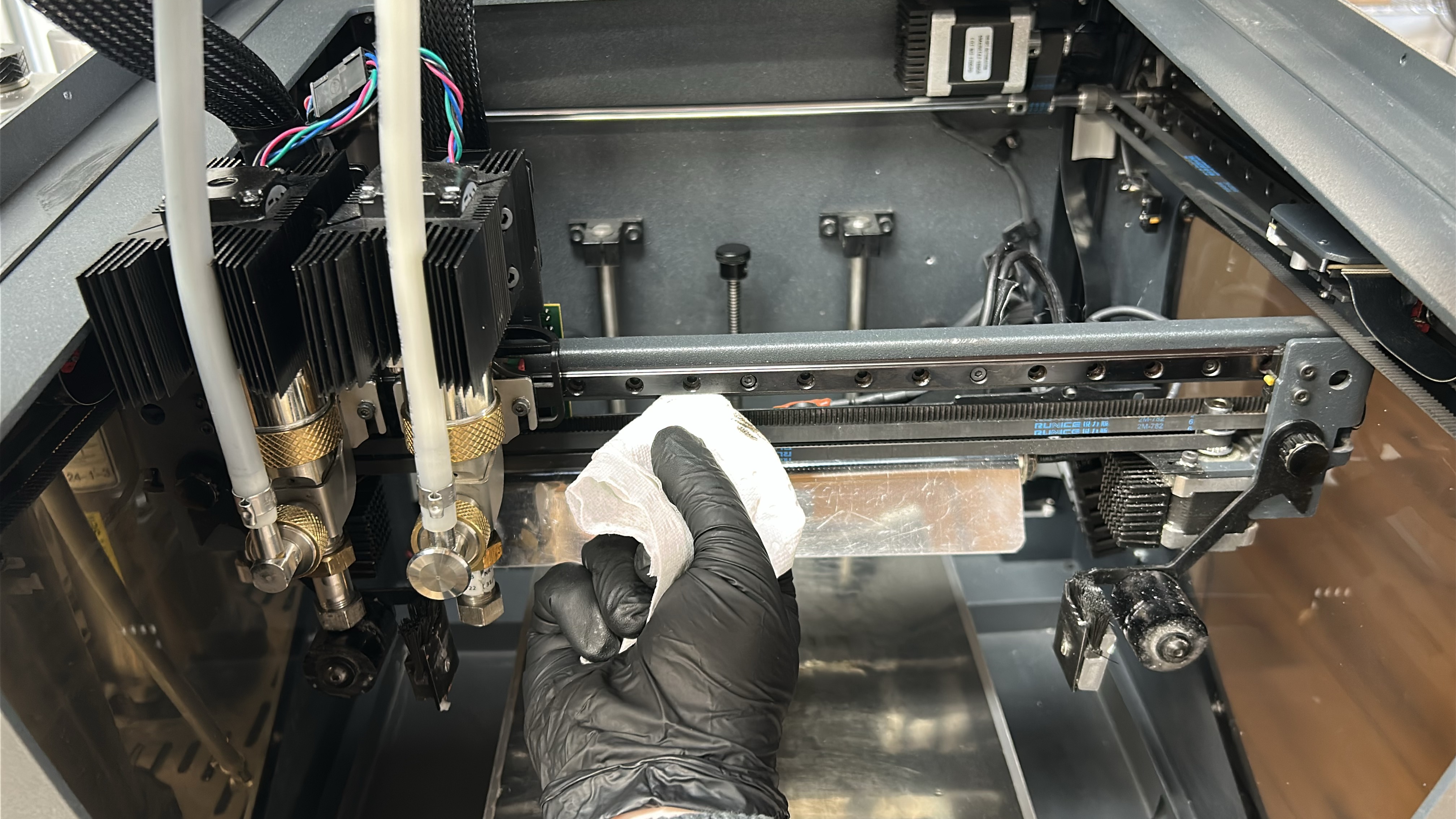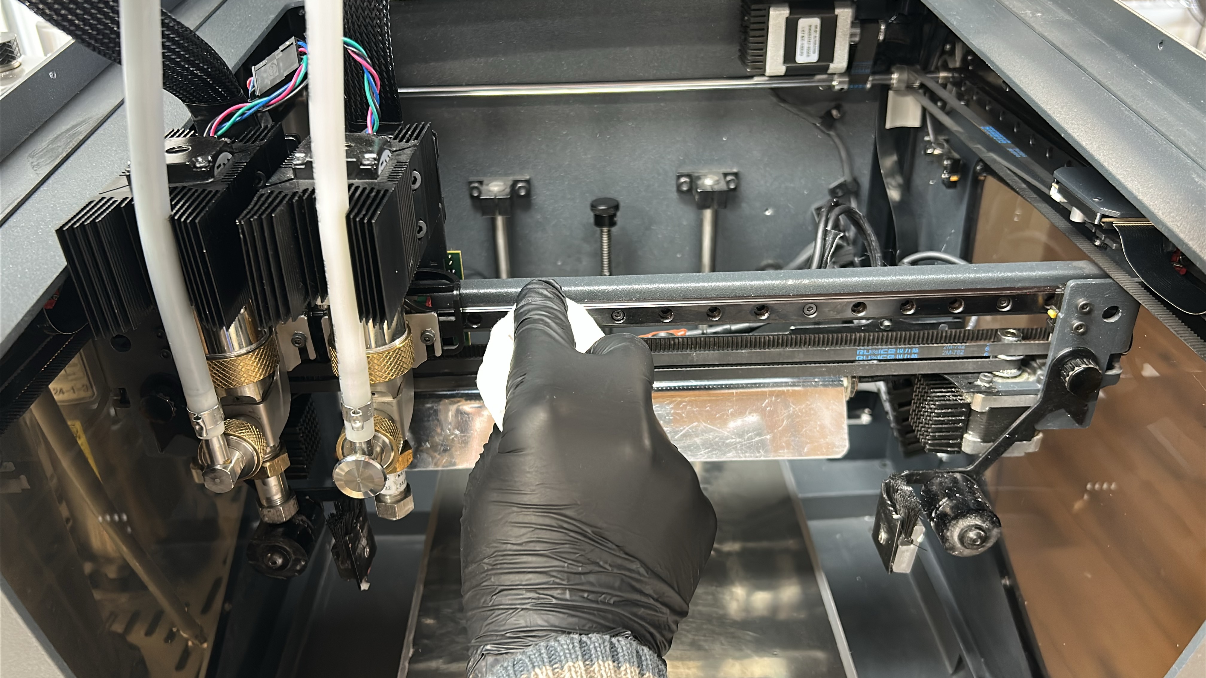 3. With a paper towel or cloth moistened with a solvent (isopropanol) wipe the X-axis linear guide, starting from the middle and moving outwards. Move the printheads to the opposite side and repeat the process on the other end of the linear guide.