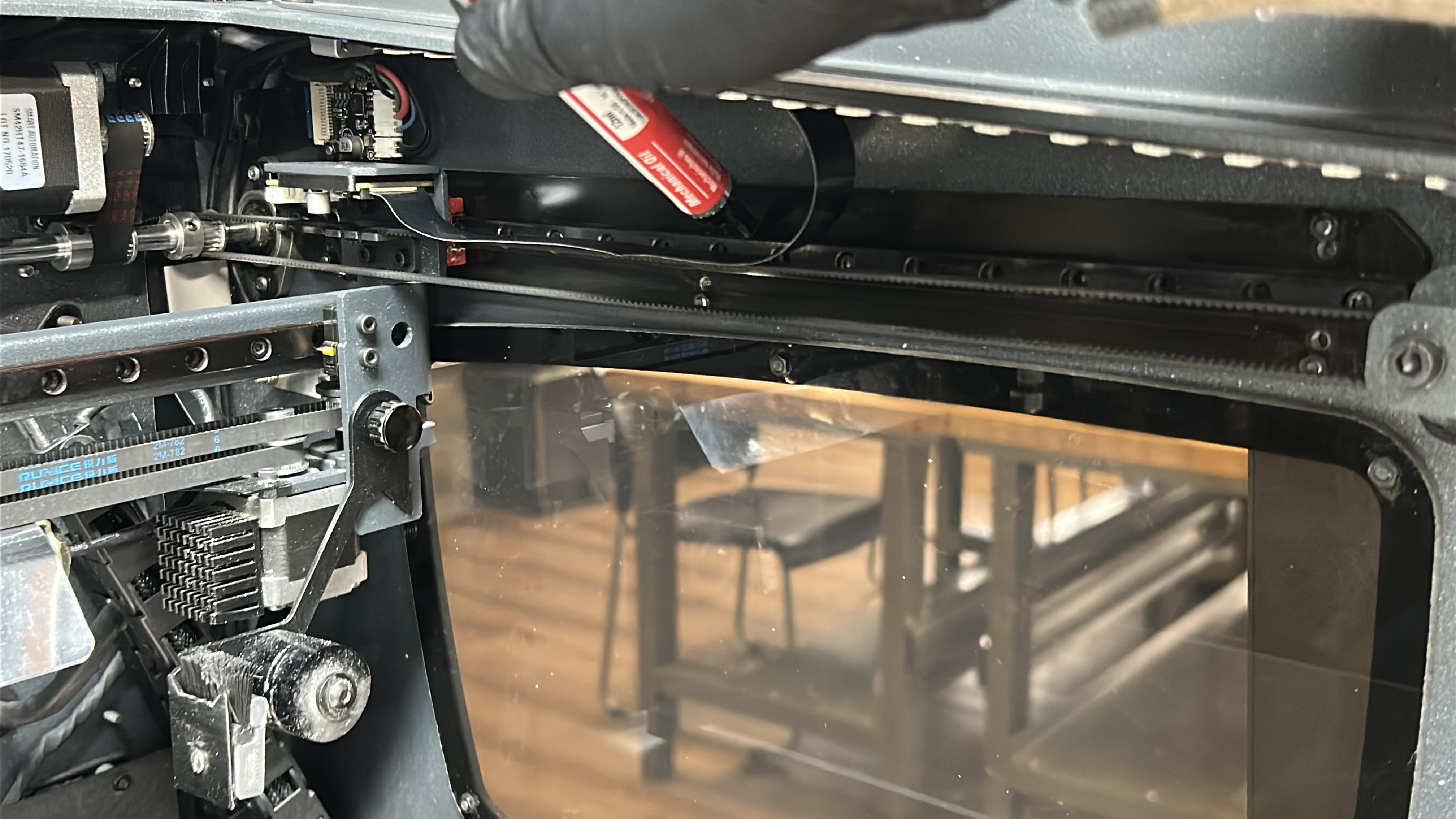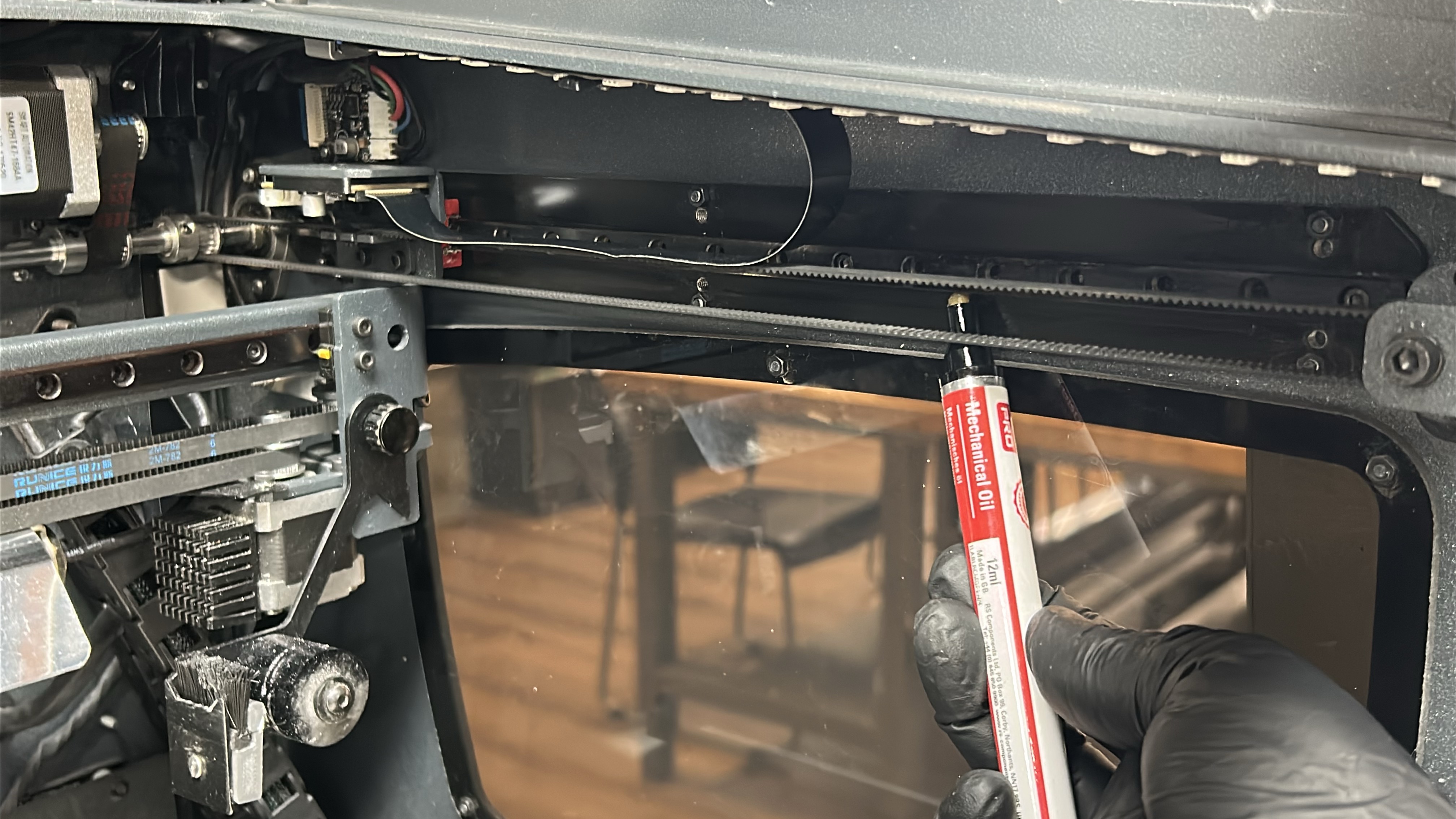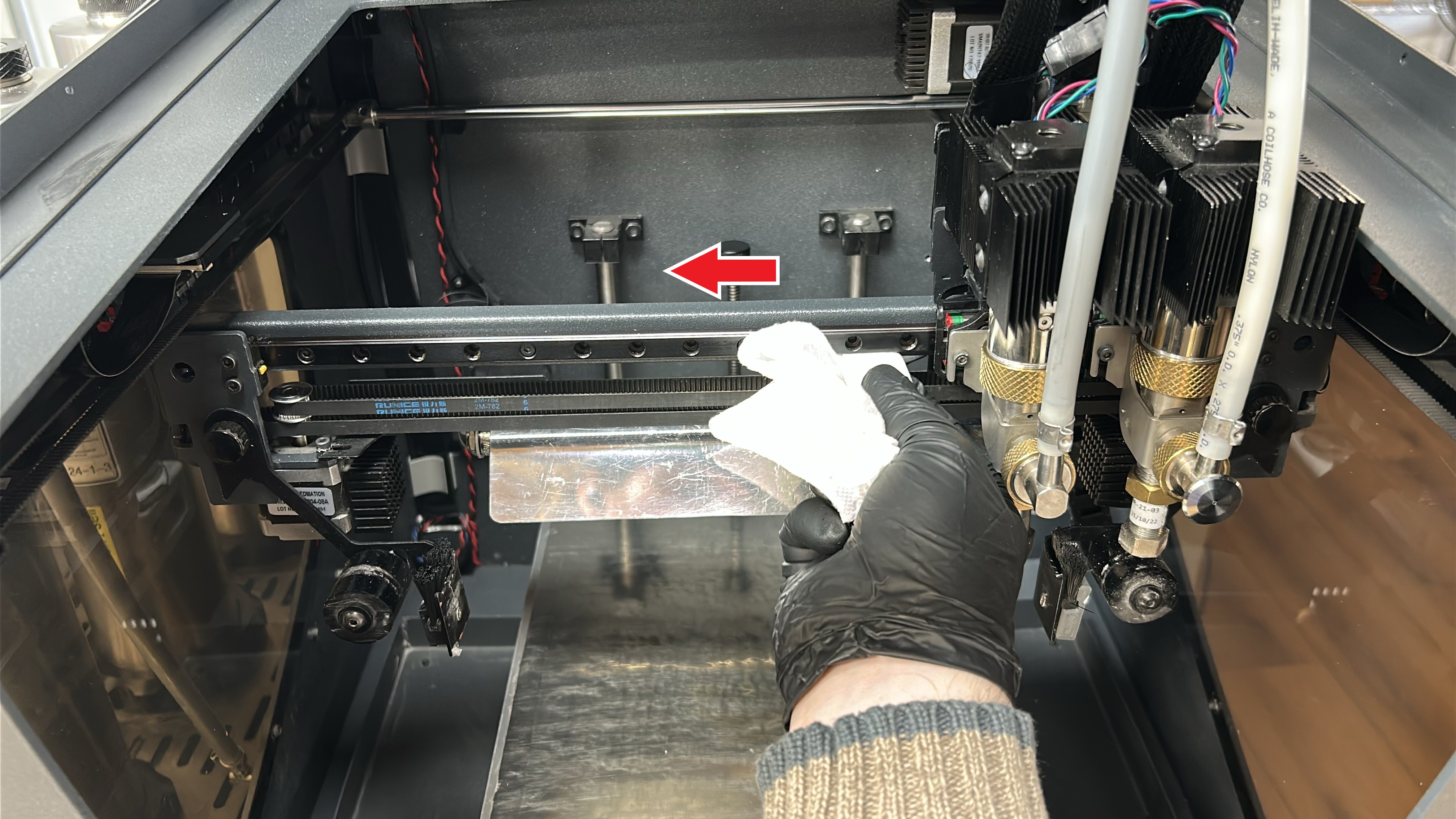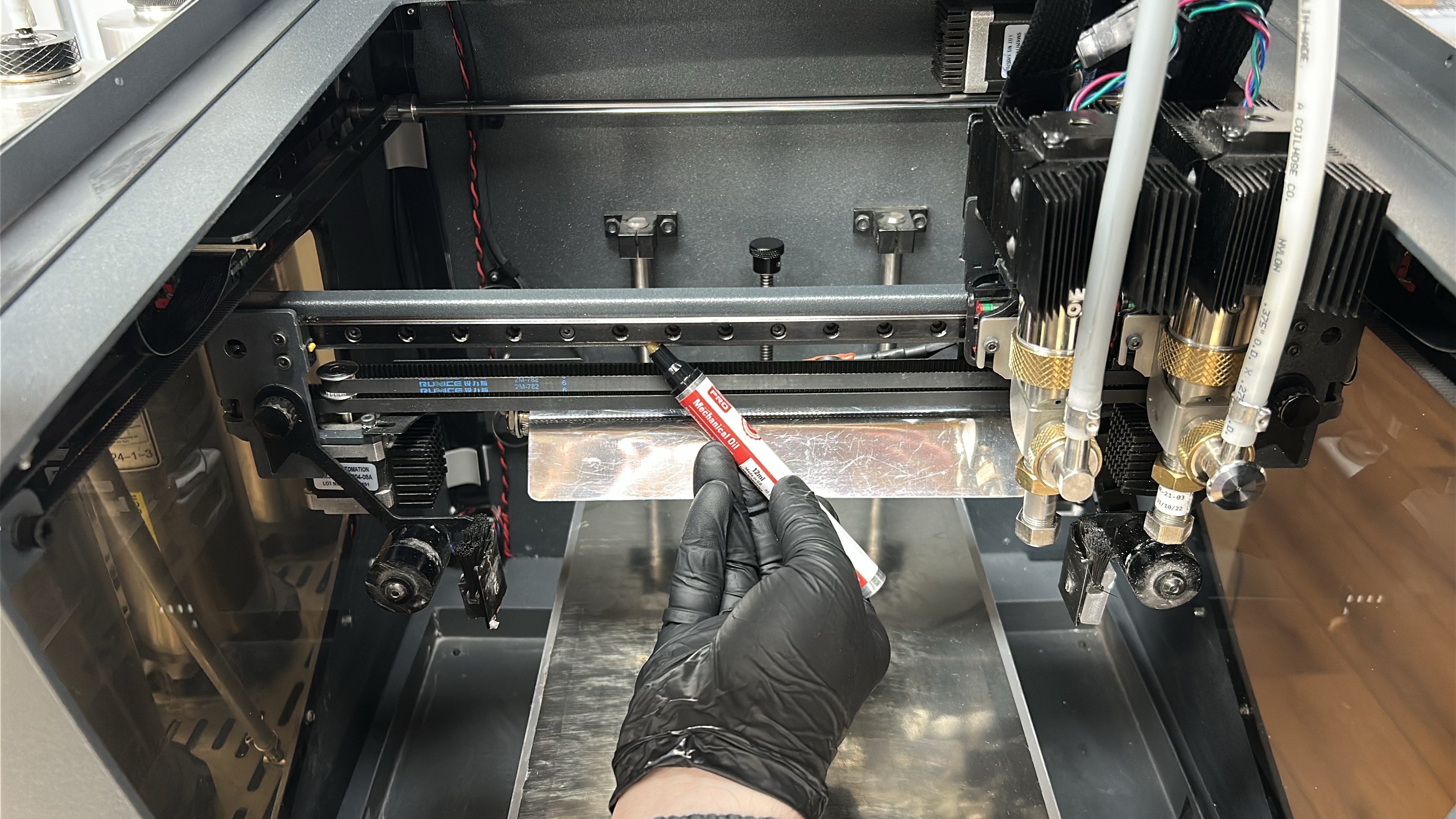 4. Use the machine oil to apply a thin coat of lubricant to the X-axis linear guide, applying with emphasis on the superior and inferior faces of the linear guides as imaged below. Move the printheads to the opposing side of the linear guide and repeat this process.