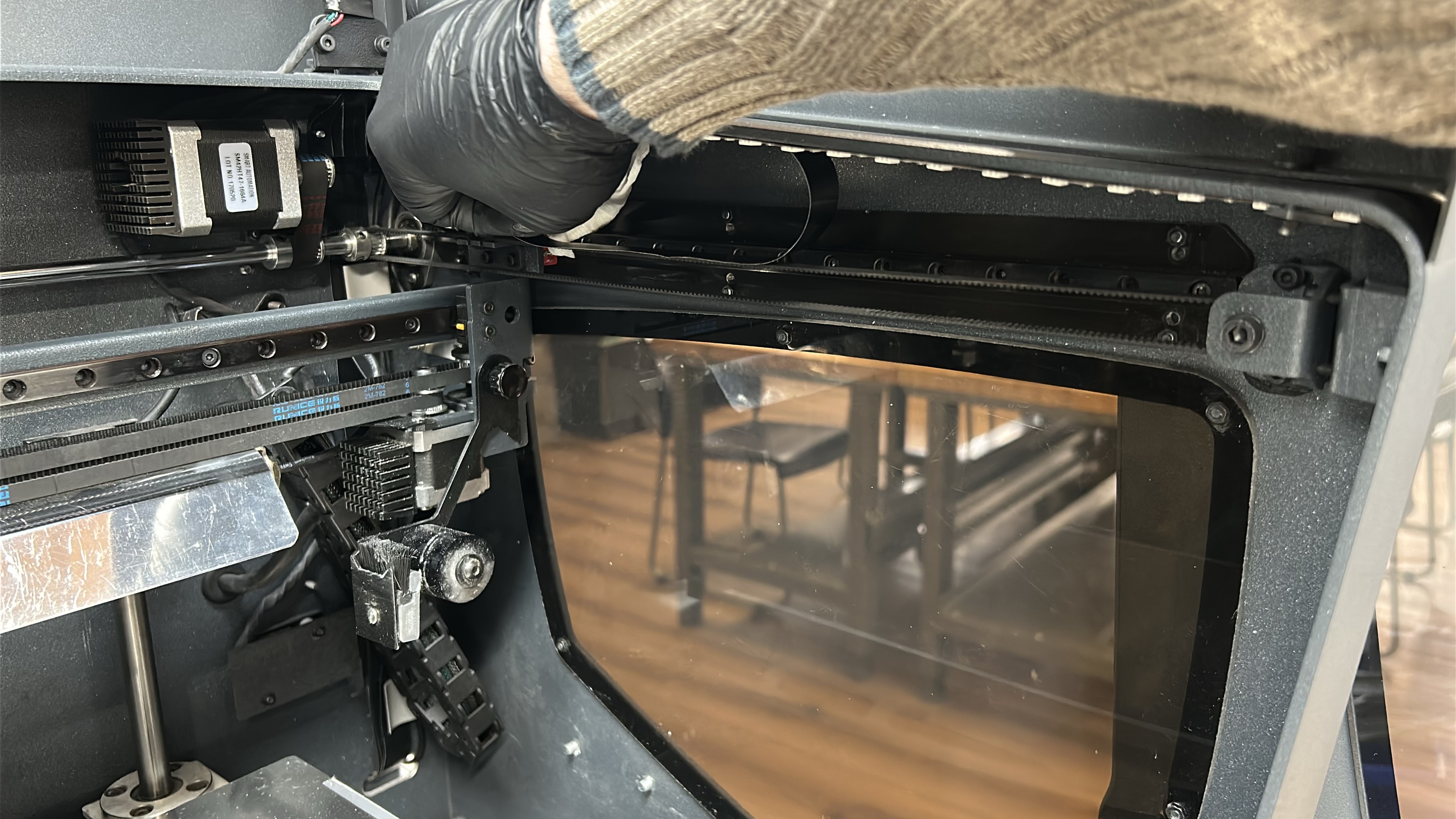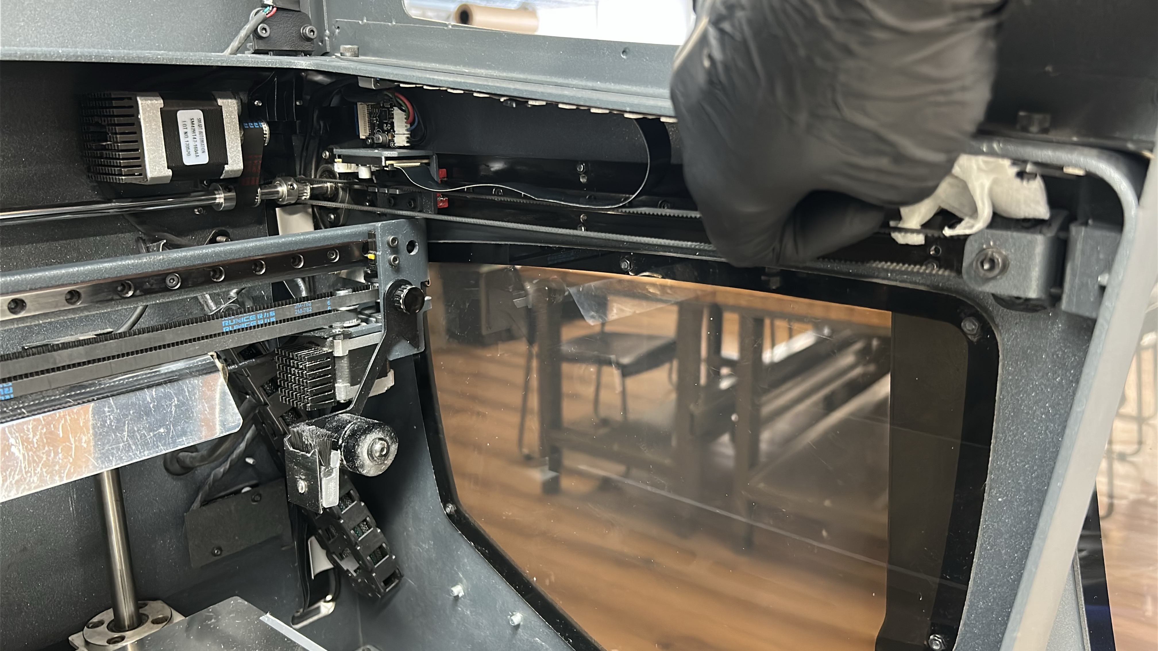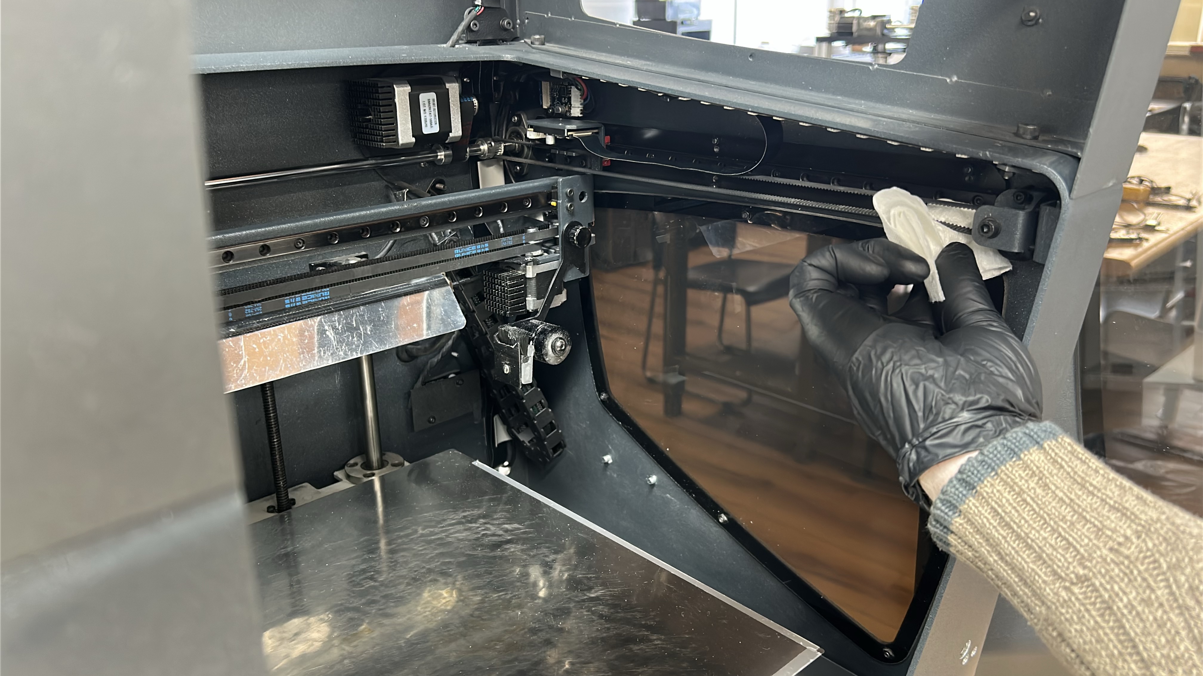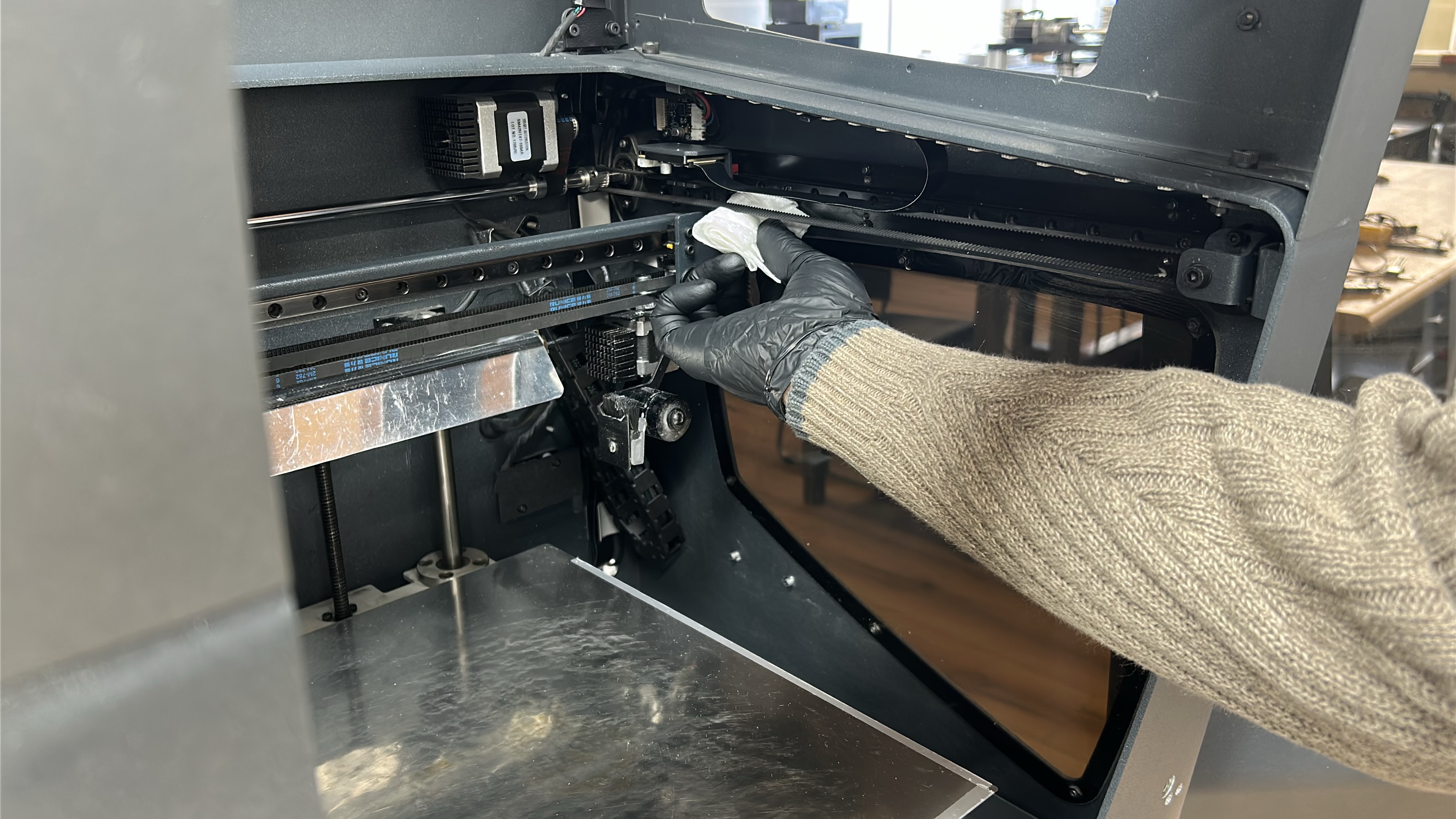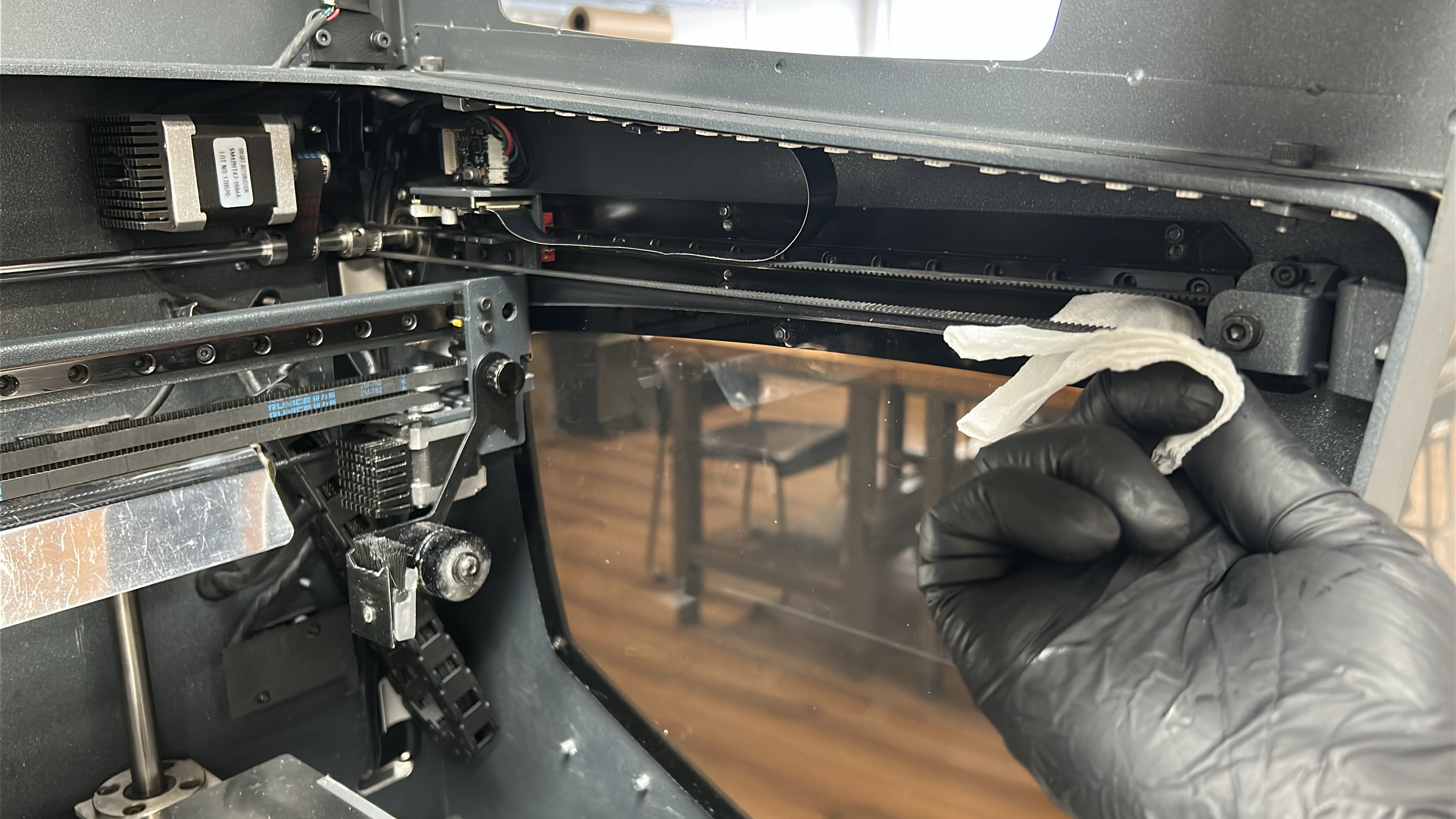 5. Start by moving the printing gantry to its parked position and powering off the printer, move the printheads to one side so that one of the Y-axis linear guides is easily accessible. Using an absorbent paper towel or cloth wipe the linear guide on the superior and inferior faces to remove any dirt or dust.