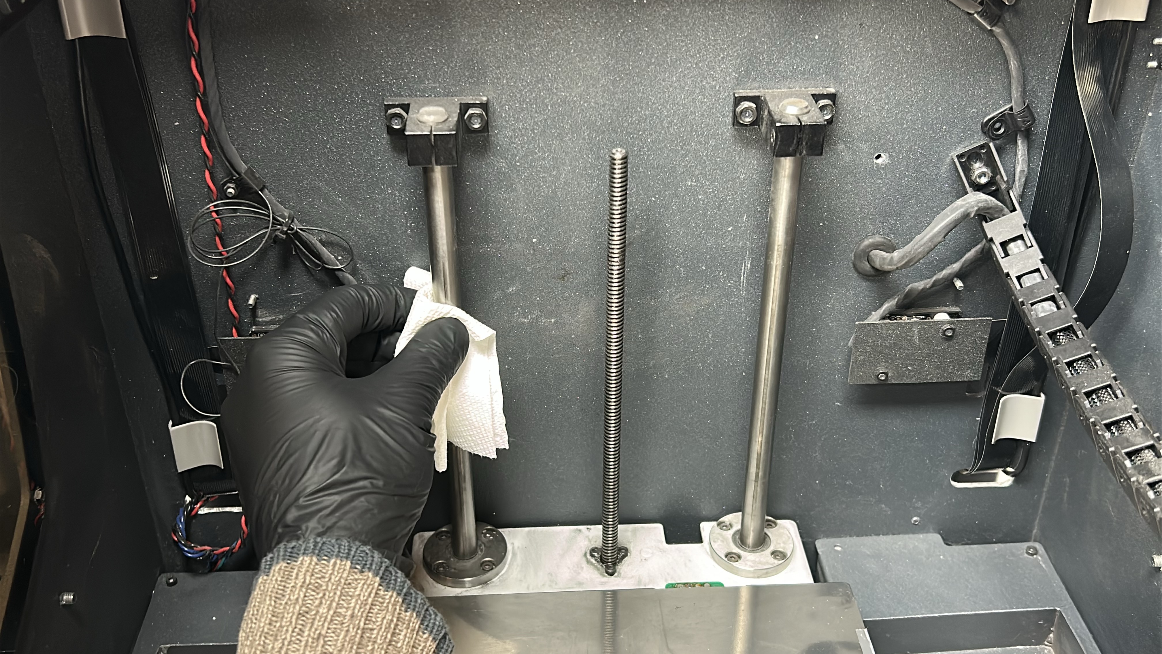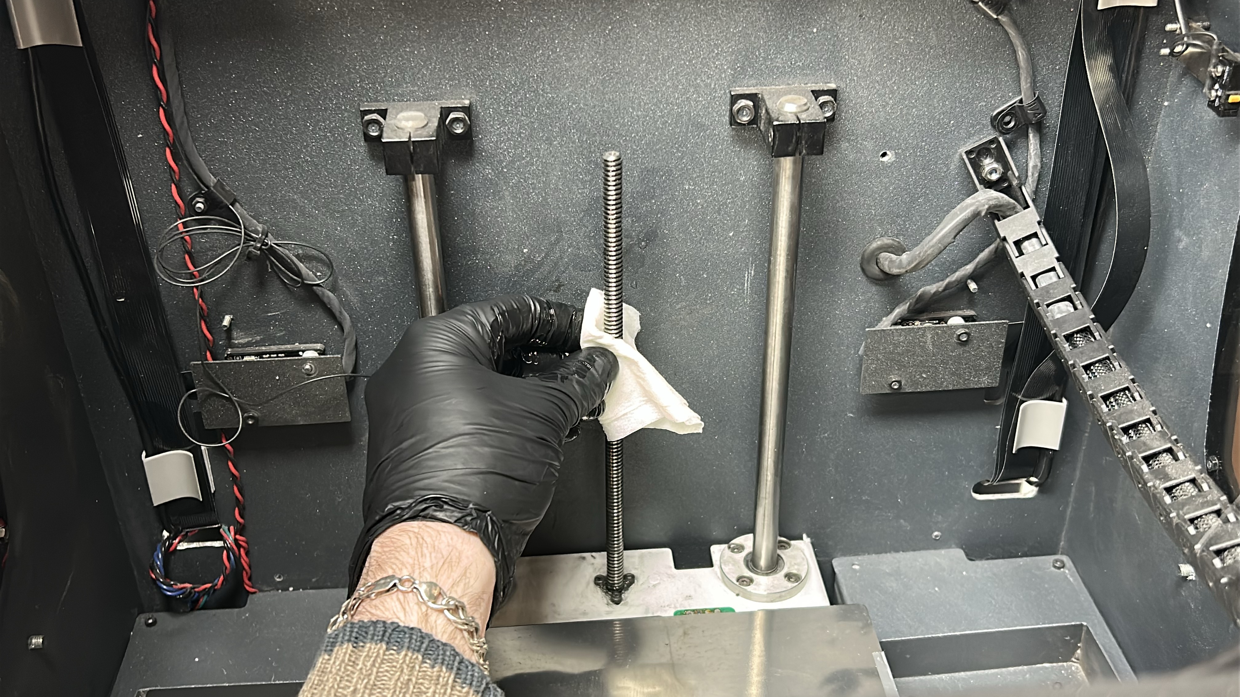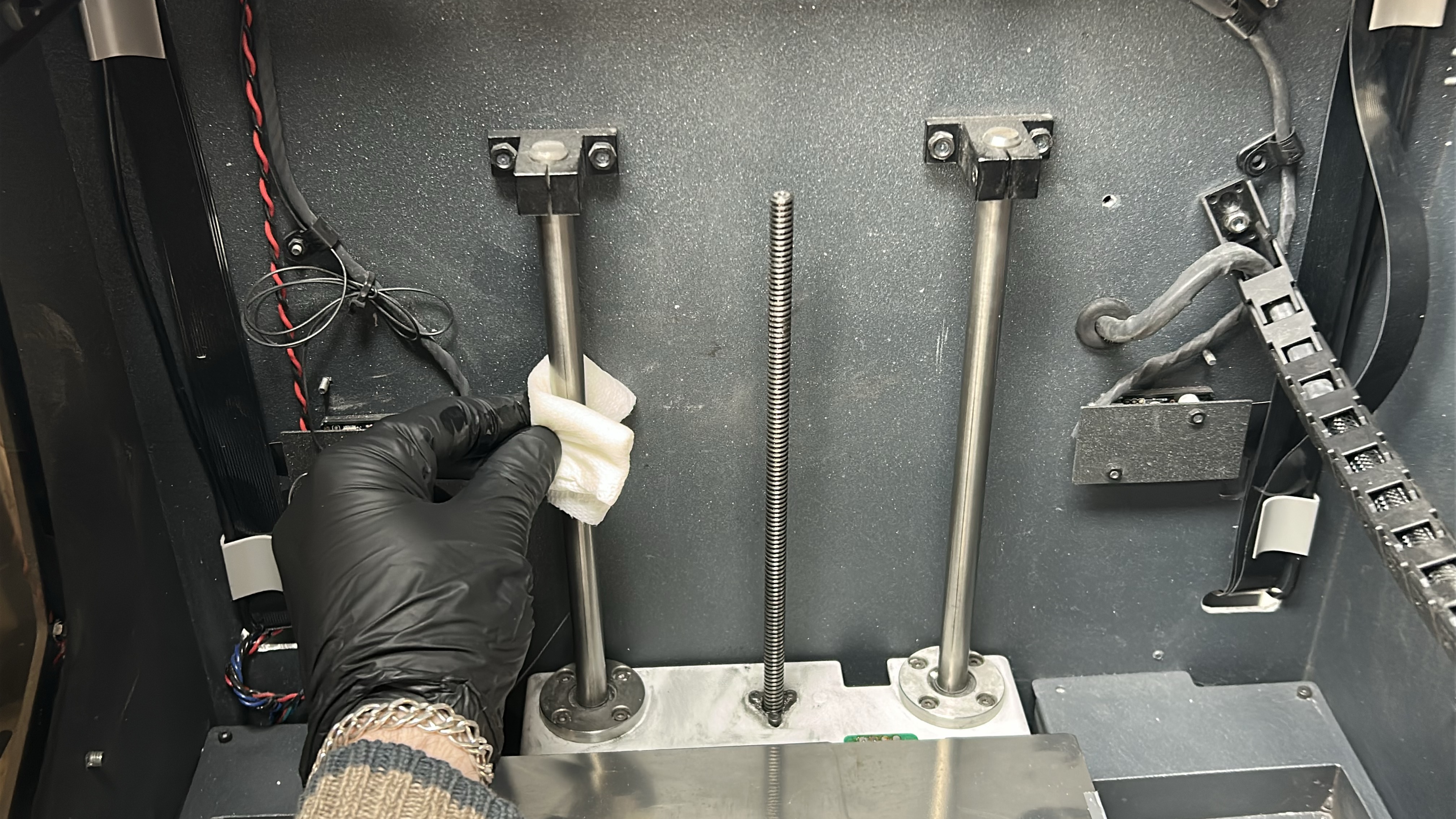 11. Apply the lubricating oil along the Z shaft sidebars ensuring no drips. Clean the Z-axis spindle with an absorbent paper towel or cloth targeting any visible sullied grease. Turn the spindle manually to access the rear.